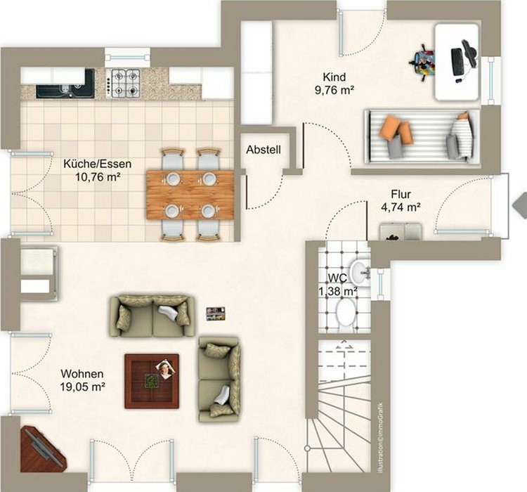 - einen großzügigen Wohn-/ Essbereich, Hauswirtschaftsraum, Garderobe & Gäste WC